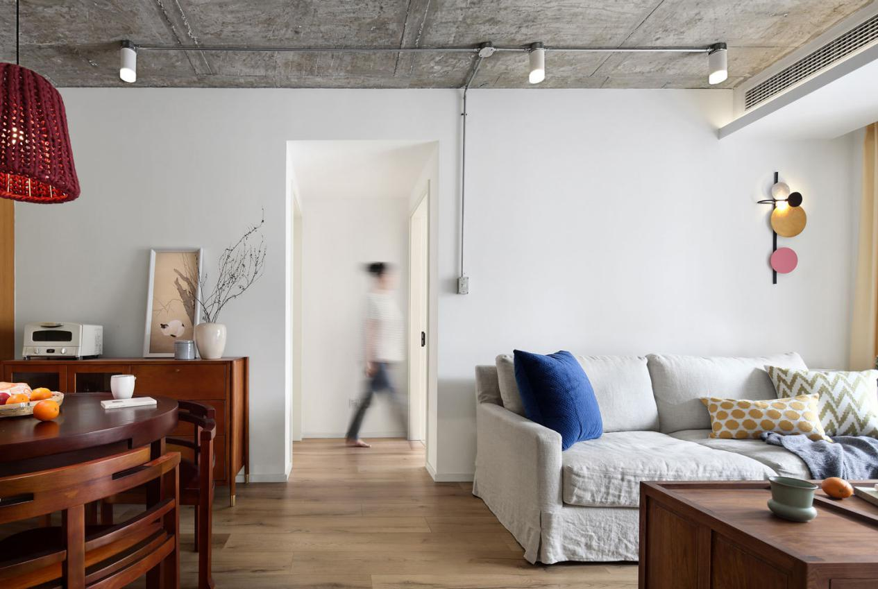 米白色布艺沙发柔软舒适,搭配颇具年代感的樟木箱,与天花的混凝土混搭,碰撞出令人惊艳的时代感。