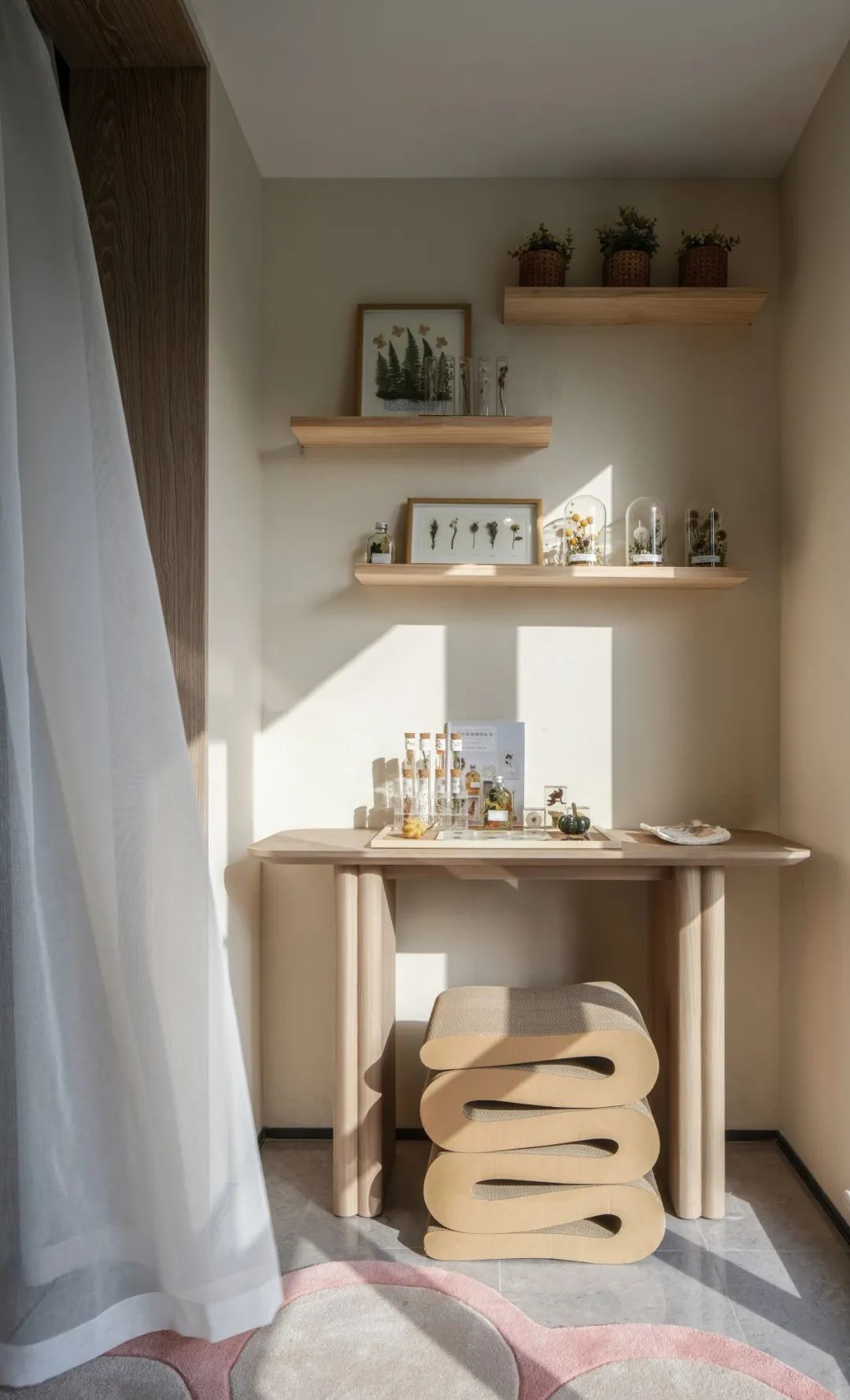 这里还是女主人时常喜欢待的角落,进行插花制作,看看书,或者就地而作坐发发呆,都是一种悠闲的生活享受。