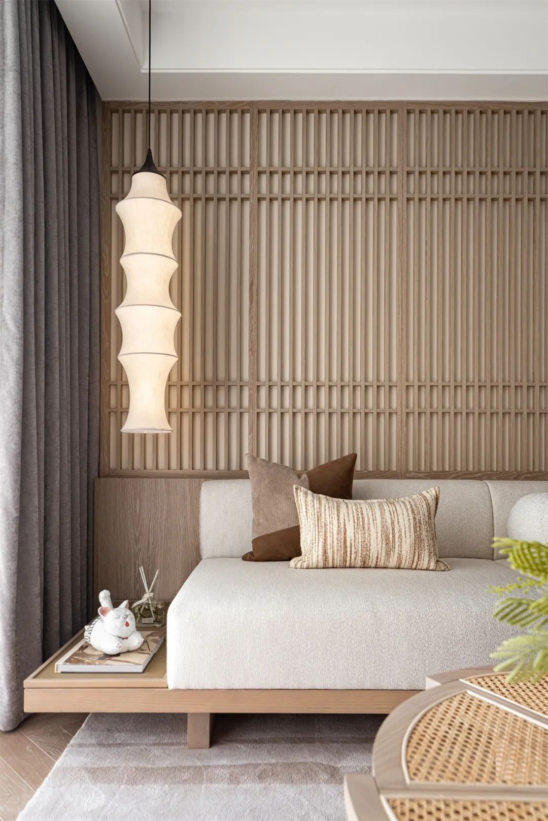 客厅氛围相当纯粹鱼骨纹木地板、原木色家具让人充满安全感,搭配背景墙的日式木格栅造型,宛若置身东京。