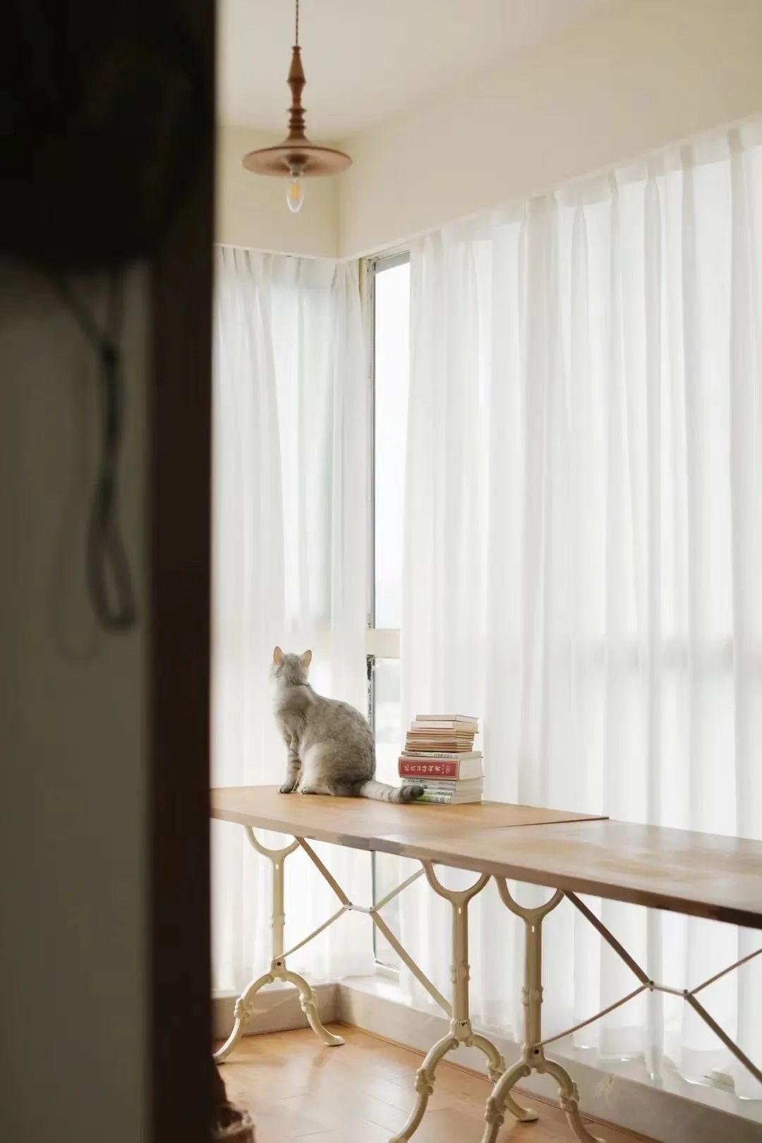 除了是主人使用的地盘,这里还是猫咪们常常小憩和发呆的乐园,随风飘动的纱帘和风景时常让它们格外好奇。