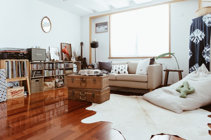 拎回一张牛皮毯搭配懒人沙发,充满了电影氛围,在柔软的牛皮上席地而坐看会儿书喝杯茶,既舒适又接地气。