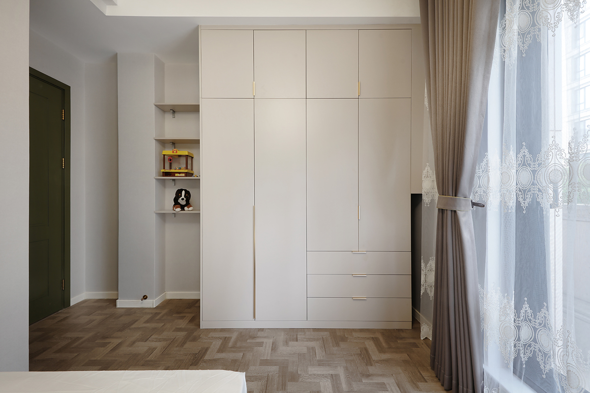 女屋主对两个孩子的房间收纳格外重视,男孩房采用多门式抽拉衣柜,并延续出摆台供孩子摆放喜欢的玩具和收藏品,地板采用鱼骨拼,有种水波粼粼的动态美。