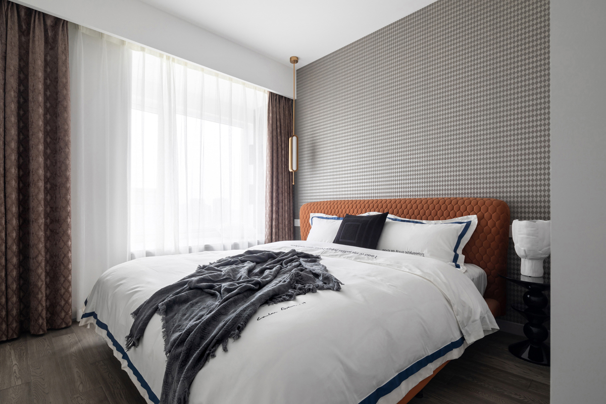 主卧舒适度极高,胡桃纹木地板、脏橘色绒面床体和棕色窗帘透露着暖意,加入多种几何图案,简洁中又不乏设计巧思。