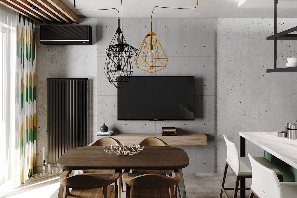 为了让空间更有趣味性与变化性,电视墙以灰色留白的形式展现出强大的可塑性。配置实木餐桌椅、铁艺掉线灯,带来温馨舒适的感觉之余,又与冷峻的水泥色墙面进行中和,展现工业风特有的质感。