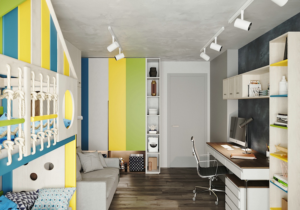 房间顶部延续公区的工业风设计,在软装和用色上跳脱固定思维,以欢快活泼的黄蓝绿等高明度色系迎合孩子的审美,希望他们的小世界一直被阳光和幸福笼罩。
