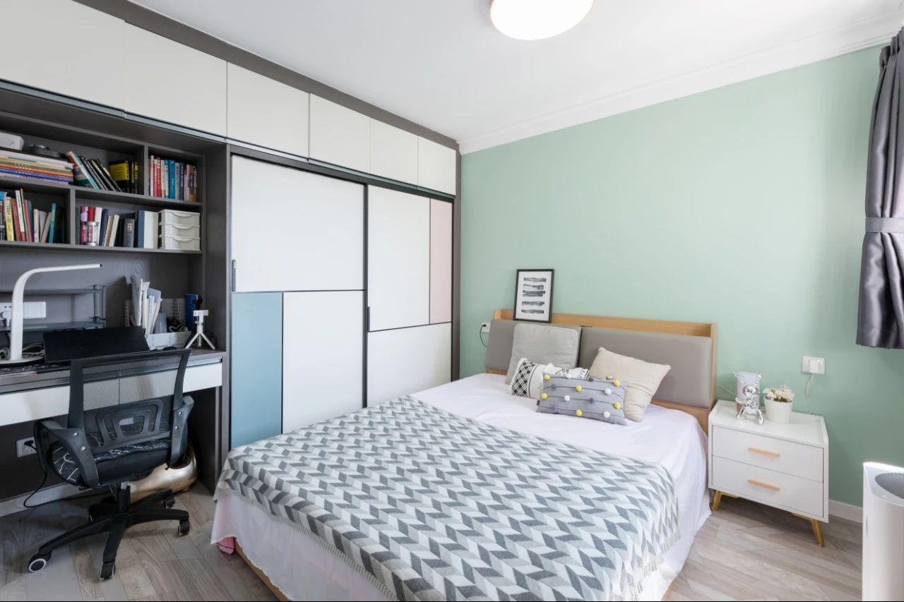 很多90后推崇自然之美,希望能在家里也感受到清新宁静的氛围,床头背景墙颜色选用了客厅沙发背景墙同款的青葱色,另一个墙面选用浅灰色,很好地进行了平衡,不扎眼也不俗套。