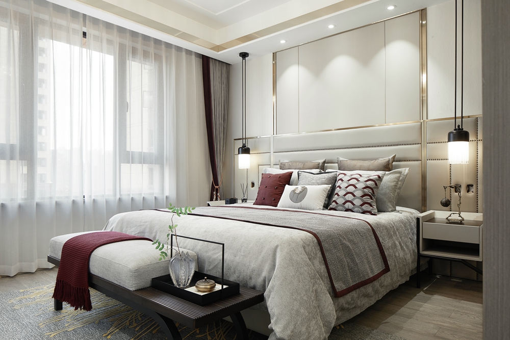 主卧以暖白色调为主,整体设计稳重大气,软包床头加上舒适的床品可以让主人拥有更高的睡眠质量。