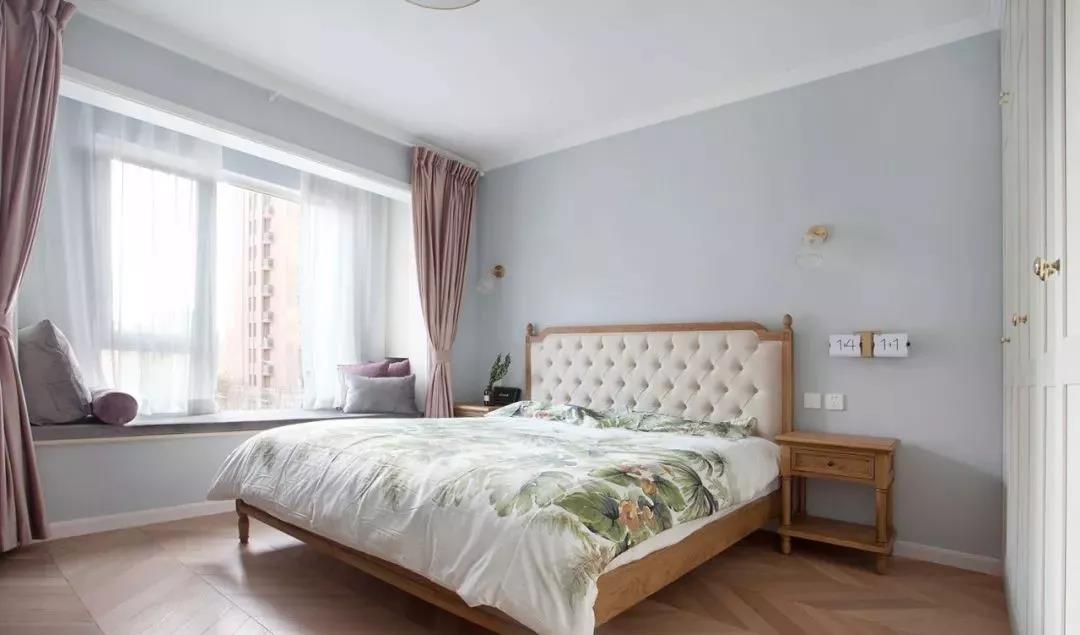 飘窗没有过多装饰,只简单的铺上了软垫,摆上几个抱枕,闲暇时间也能在这里看看书,望望窗外的风景。脏粉色的窗帘挂在清爽的卧室不会觉得突兀,竟还有几分温暖感。