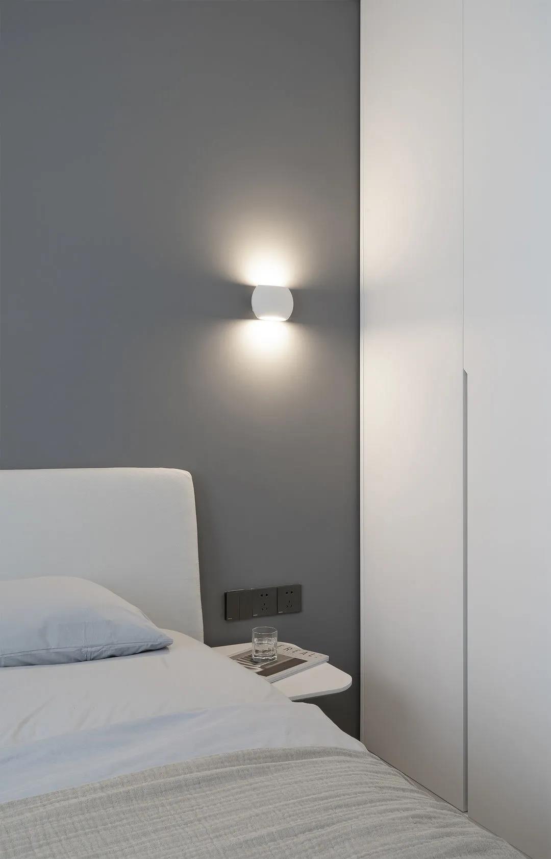 次卧同样定制通顶衣柜,不留卫生死角。床头设置插座,方便手机充电。对称的壁灯散发的光晕营造温馨氛围。