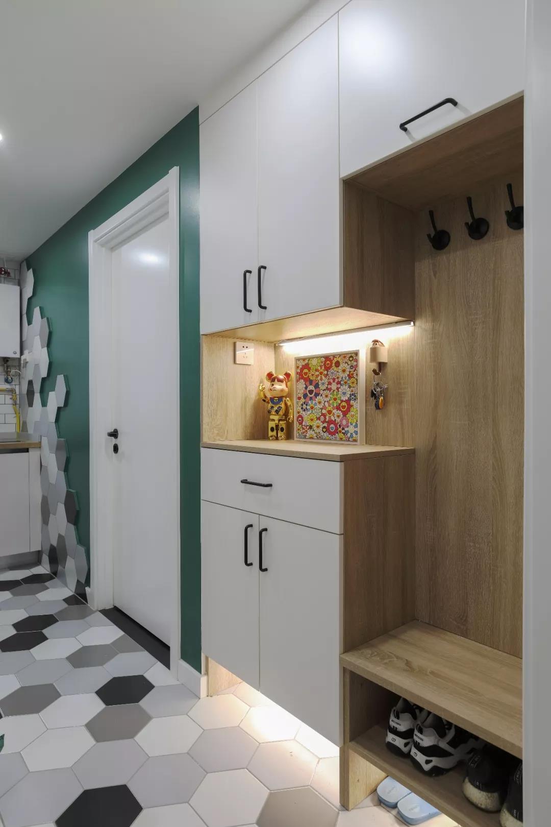 入户设计通顶玄关柜,上下柜体分别用来收纳鞋子和行李箱。旁边衔接的胡桃木双层隔板摆放每天进出门所需的鞋子。三个黑色的衣钩,用来悬挂钥匙和包包。