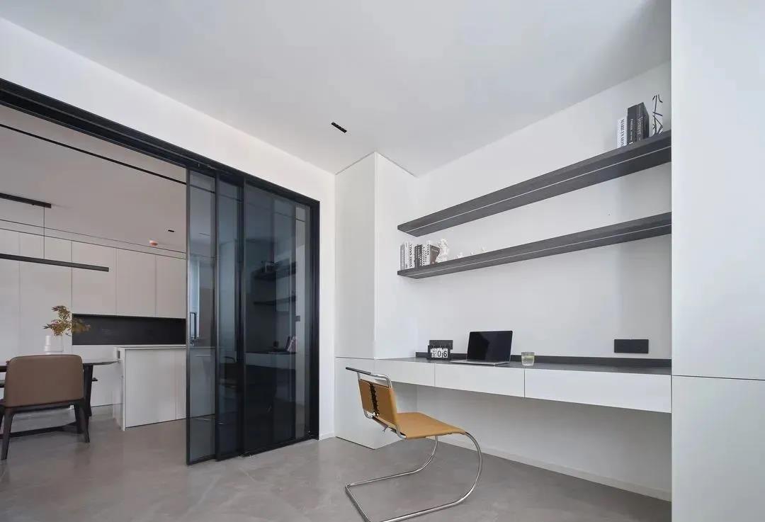 书房同样采用了玻璃材质的推拉门,打开房门小书房更加宽敞。书桌并不是普通的成品书桌,而是现场定制的简约款式。书桌上方还打造了长板搁物架,可以摆放很多的书籍,拿取物品时也能更加快捷,一目了然。