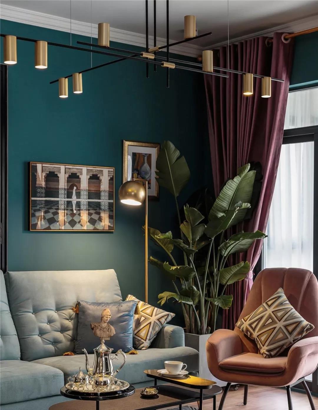灰蓝色的绒面沙发舒适度很高,搭配黑色铁艺茶几,显得简约大方,背景墙选用蓝绿色进行填充,与沙发形成同一冷调,又和脏粉色单人沙发及窗帘对比撞色,使整个空间格调更为雅致时尚。