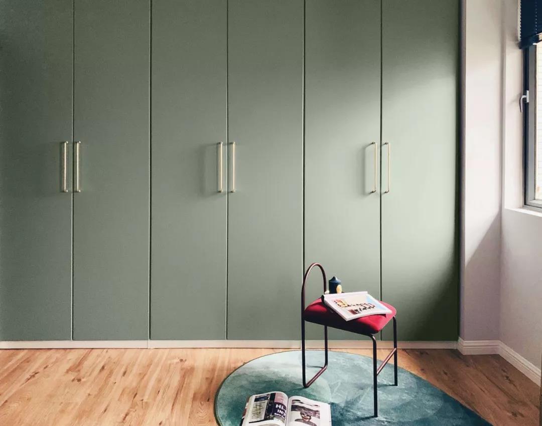 床尾定制一排到顶多开门衣柜,柜门做成薄荷绿,清新素雅,玫红色的小椅子很吸睛,为空间带来一抹靓丽的美。