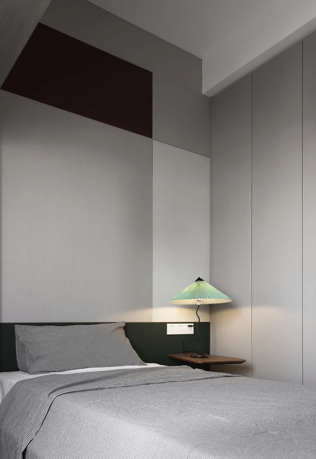 次卧留作客房,以灰白色为主。一张简单的大床铺上棉质床品,偶尔有亲朋留宿也不成问题,将来屋主有了孩子稍作调整就能满足长期使用。