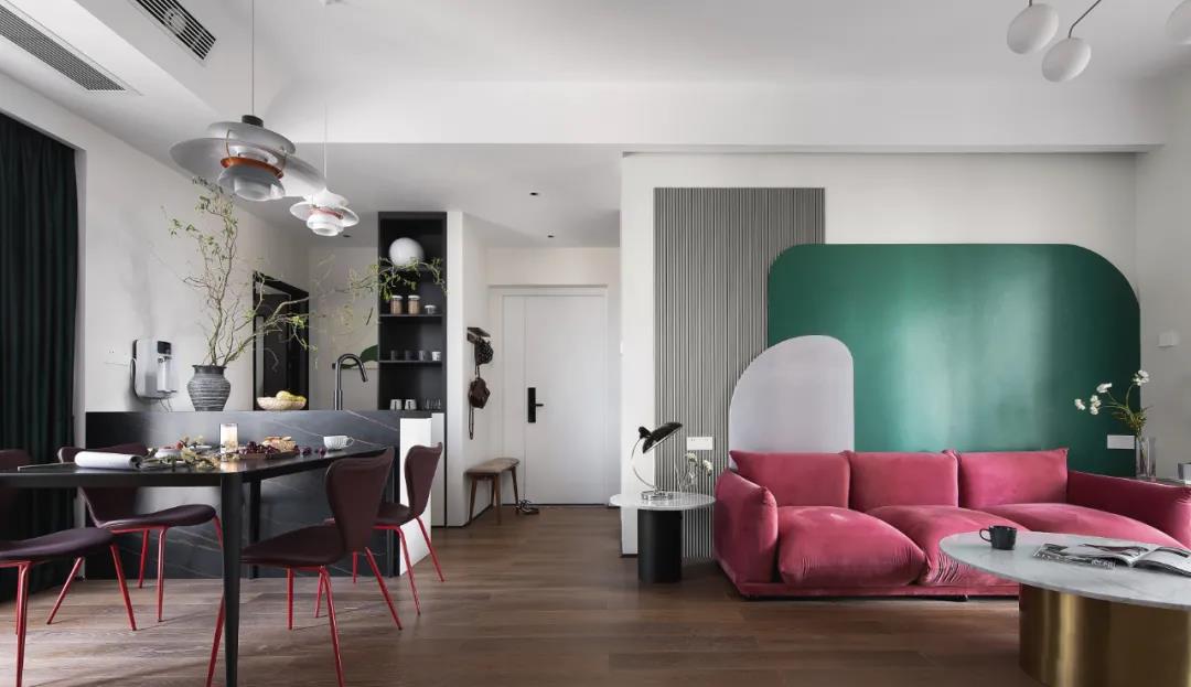 客厅选用复古感浓厚的墨绿色拼接背景墙和砖红色丝绒沙发搭配,形成精致饱满的浪漫风情。同时为了营造更高级的质感,选择了大理石台面的茶几和黑色皮质单人沙发凳,塑造出庄严稳重的氛围感。