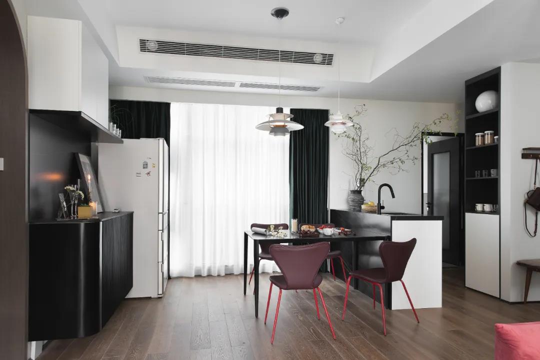 黑白撞色的吧台划分出餐厅与厨房的边界,沉稳大气的黑色仿石台面与飘逸的白纱+墨绿缎面窗帘相得益彰。一种平静的美好在材质的互通中温柔浮现。