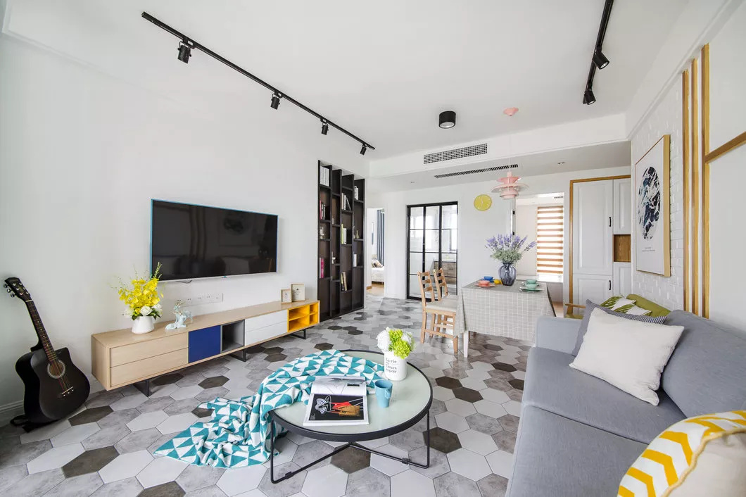 我们根据屋主需求打破常规,地板选择拼色六角砖,风格选择当下最爱欢迎的北欧风加以文艺元素点缀,最大限度让空间开阔、舒适、通透,在收纳和布局细节上也做到更为实用精细,为居住者提供最为舒适的体验感。