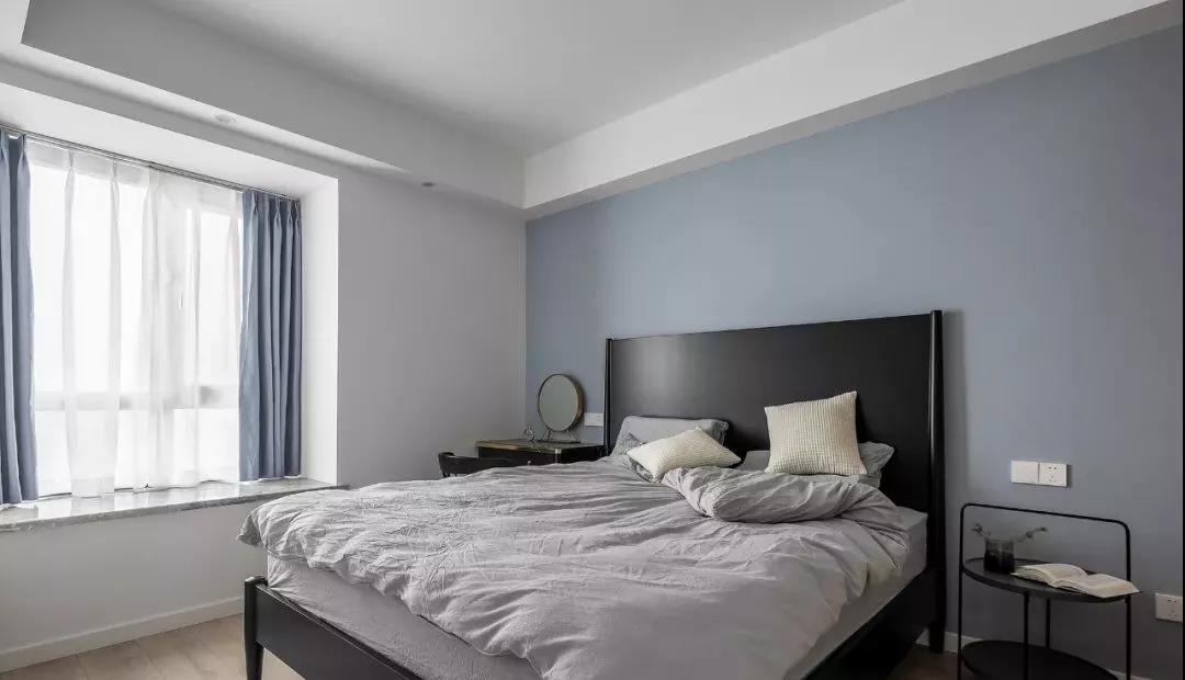 蓝灰色与黑色的搭配安静而祥和,让人想起了静谧的天空。用梳妆台代替床头柜富有创意,不仅节省空间,也让功能更加丰富。