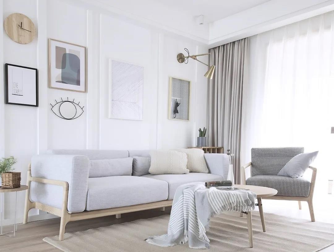 布艺材质一直是我钟爱的,与原木是绝配。这里我藏了一个小心机,选择浅灰色的沙发,这样后期我加上沙发垫或者沙发套更好搭配一些。