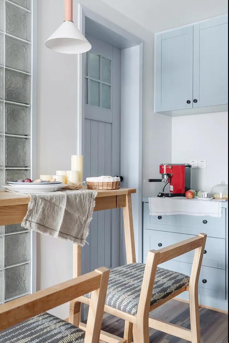 最具特色的就是一整面半透明的玻璃砖墙了,小小的厨房顿时生动有趣起来。