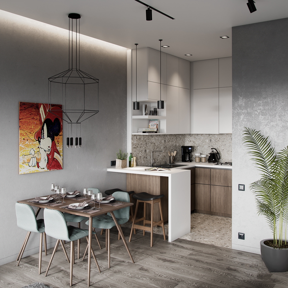 巧省空间,物尽其用,从厨房延展出来一个小吧台,既起到了吧台的作用,又充当了一个小隔断。