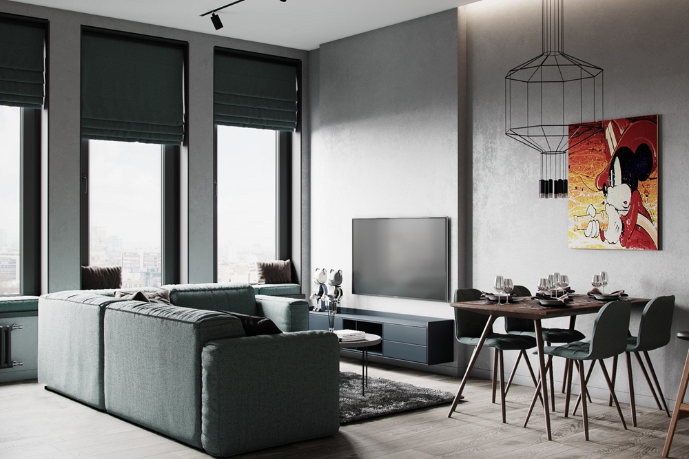 客厅以深灰色为主色调,多扇窗户为室内带来充足的光线,布艺的沙发柔软舒适,周末的时候很喜欢和男朋友窝在这里看电影。